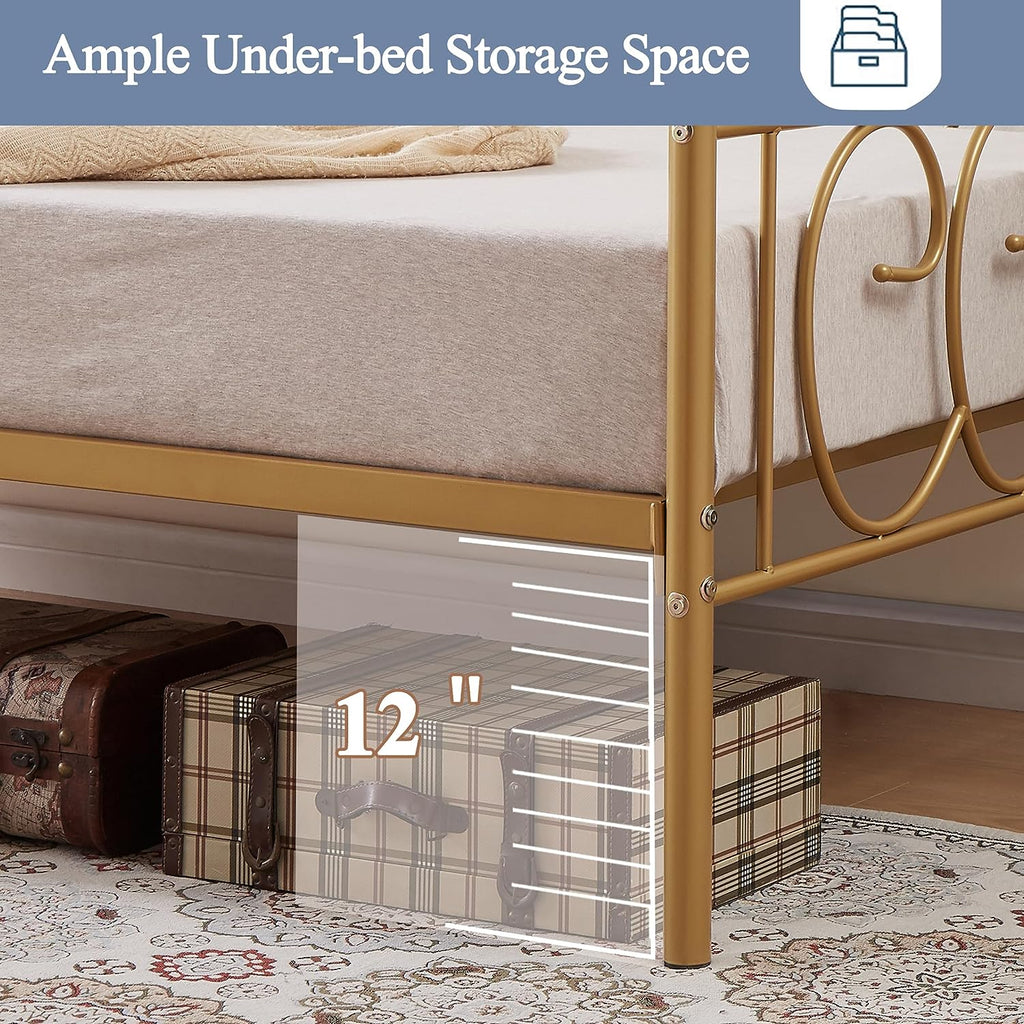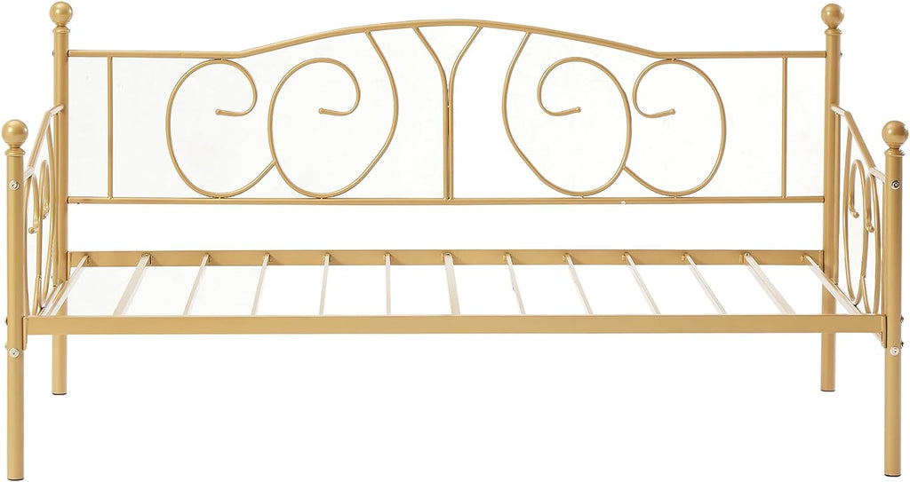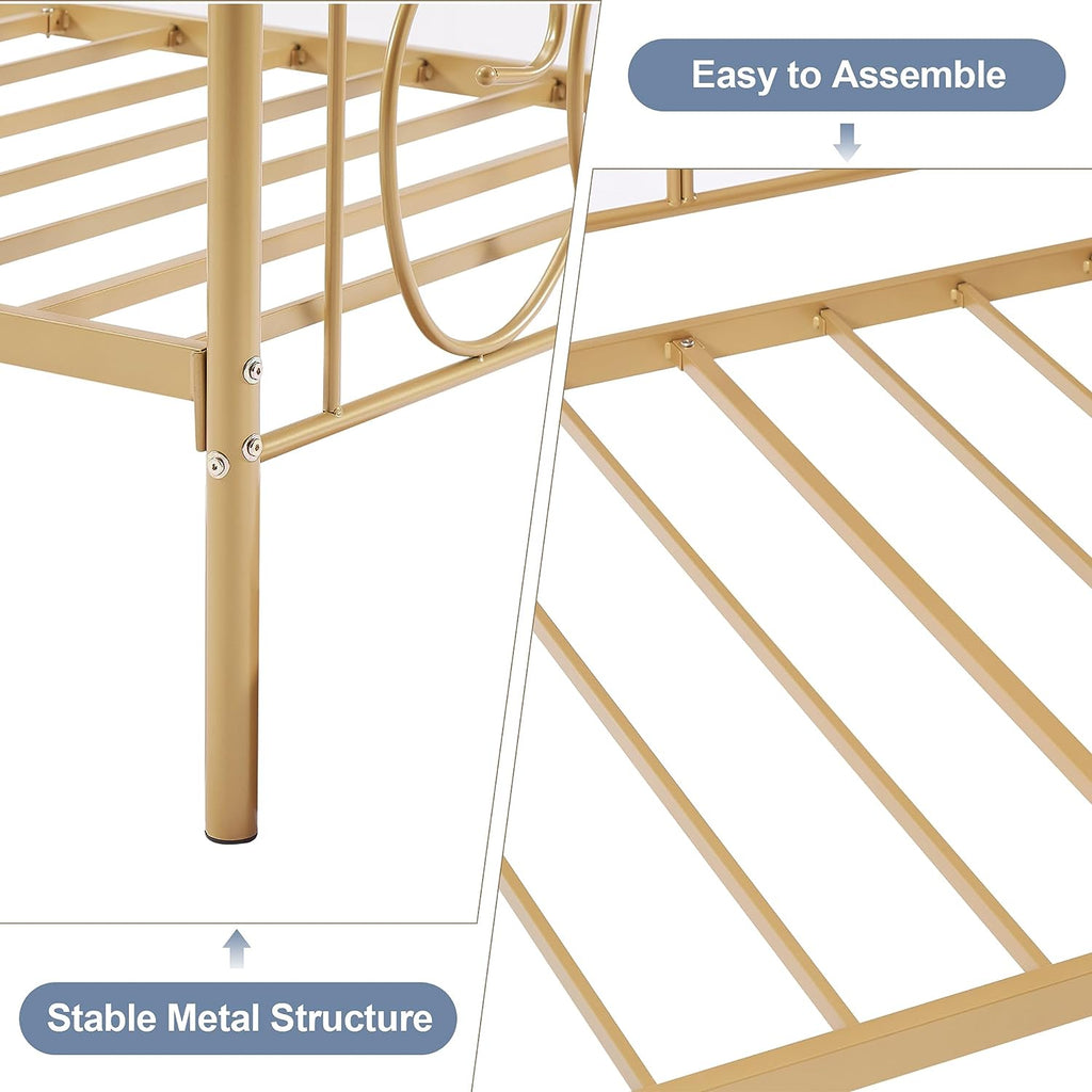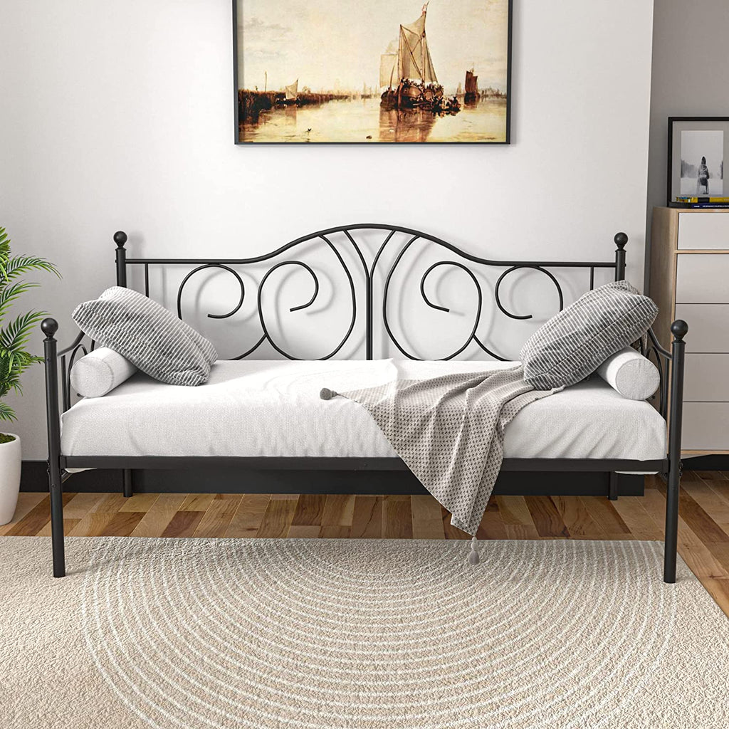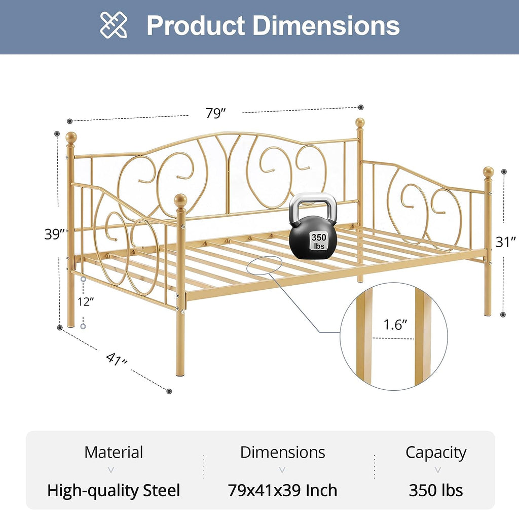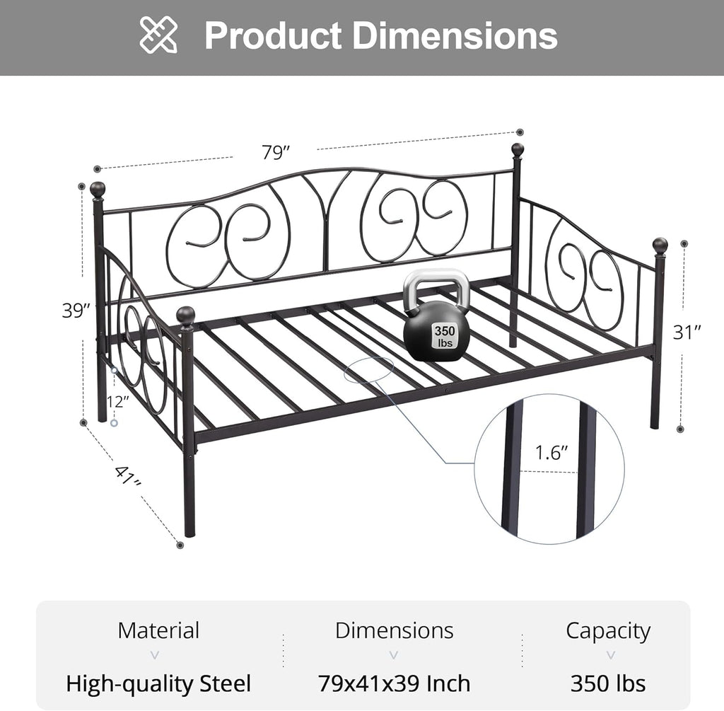• Twin size metal daybed frame structured with heavy-duty metal ensures durability and stability. Strong mattress foundation and no box spring needed. No mattress