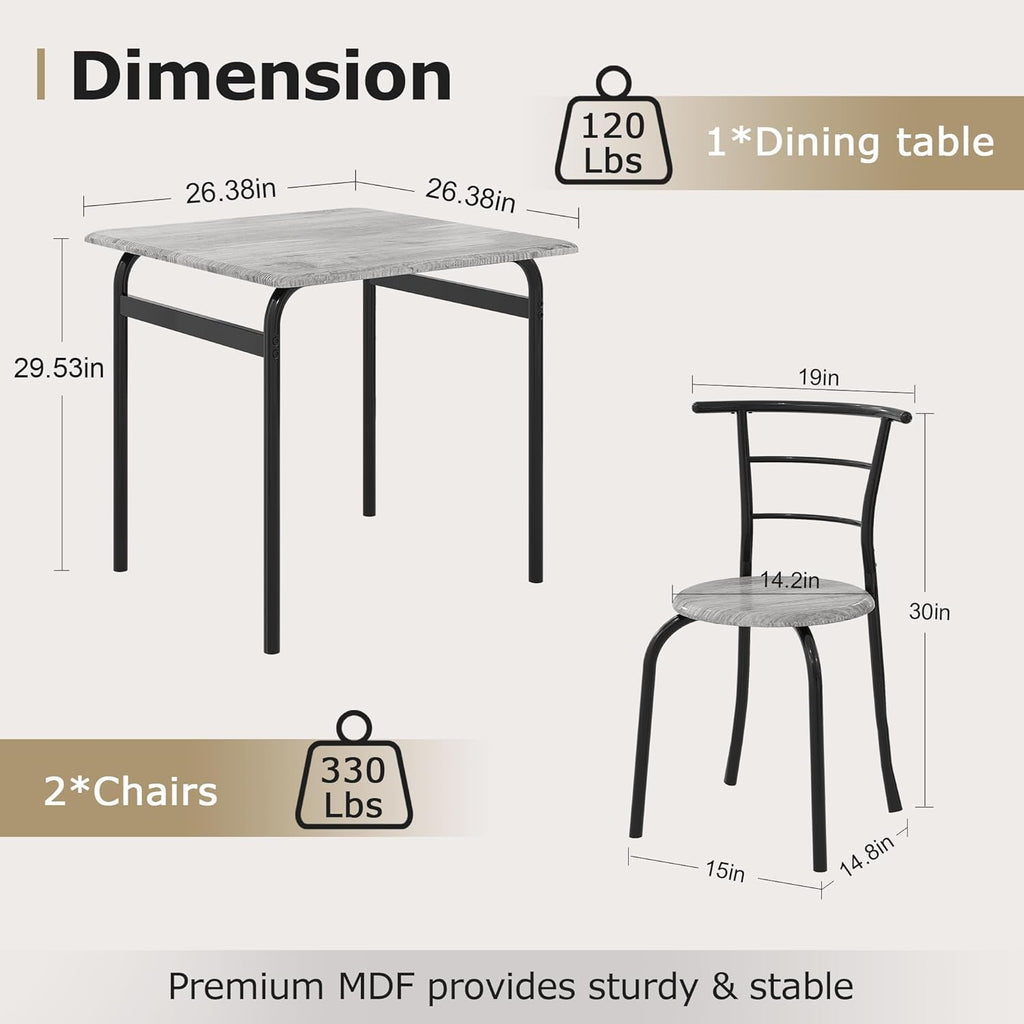 • 【3-Piece Dining Table Set】The dining table set includes a square dining table and two chairs. 3 piece dining set provides a comfortable dining space for two people. It's both practical and stylish, and it'll give your kitchen or dining area a modern touch.