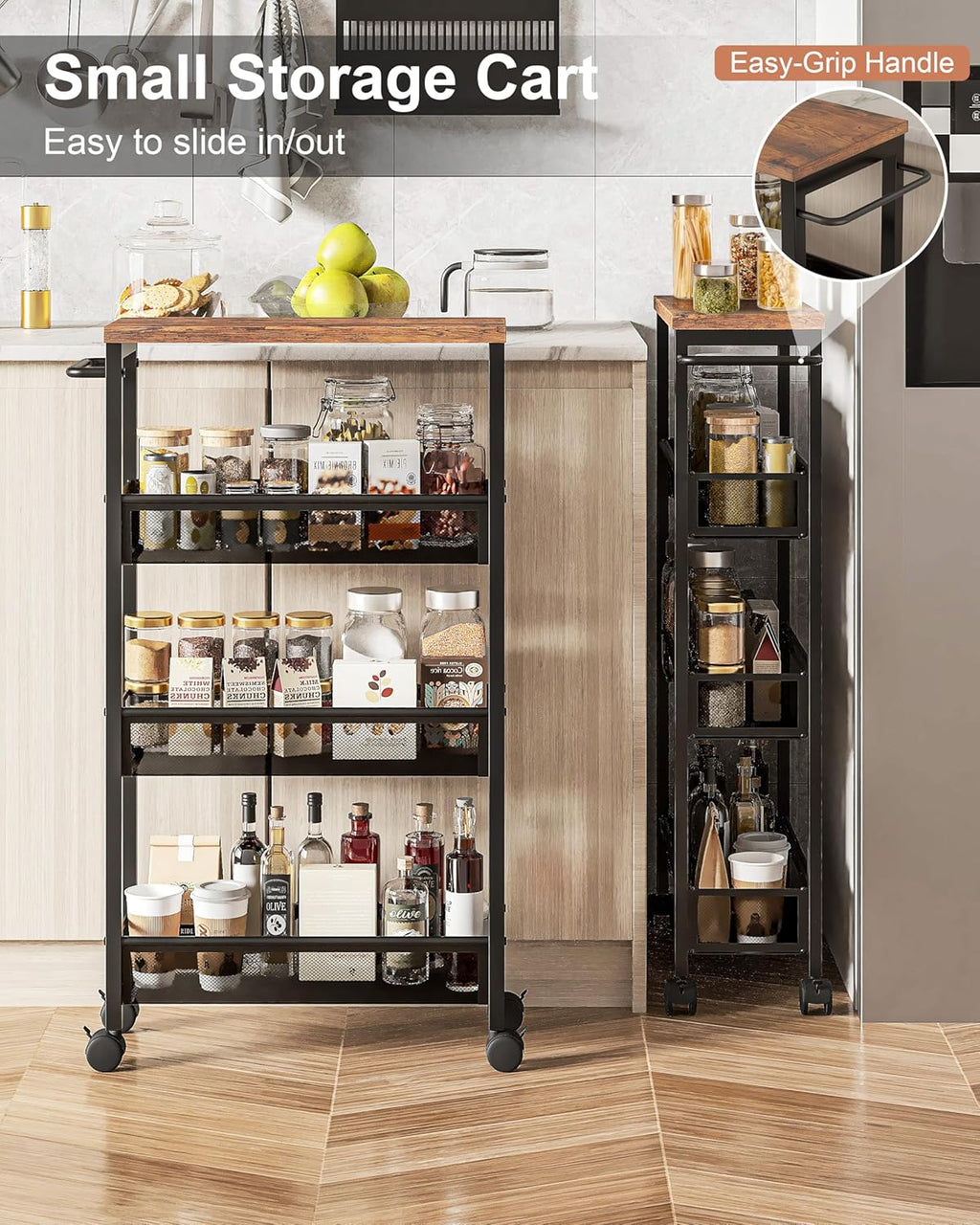 • Vintage Top Design: This snack cart vintage wood-grain top complements any decor and provides extra space for small appliances, spice jars, or decorative items, enhancing your home’s style