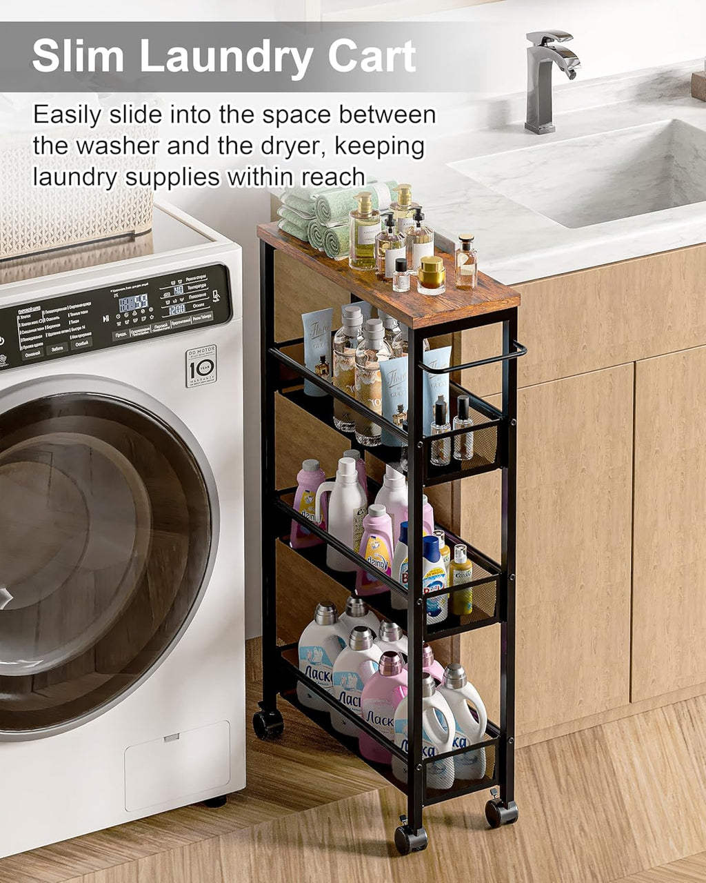 • Ultimate Space Saver: This 17.9*7.1*34 inch slim rolling storage cart is designed for slim spaces, fit beside the fridge, washer or in cabinet gaps. Perfect gap filler for unused corners