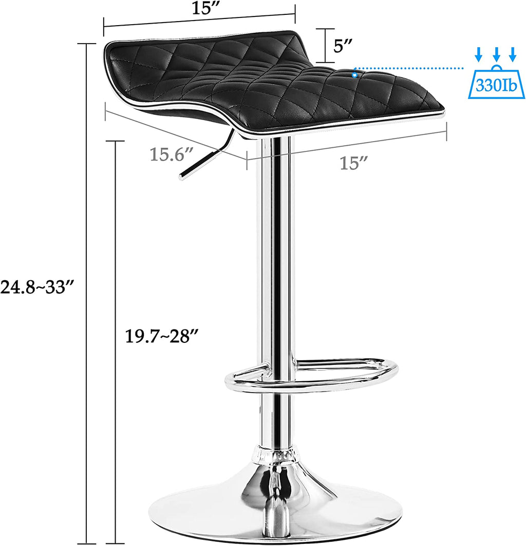 • What You Concern More: 330 pound Max load capacity for one stool; cushion dimension:16.9 X 15.4 inches; back dimension:16.9 X12.6inches; adjustable seat height: from 24.4 to 32.7 inches.