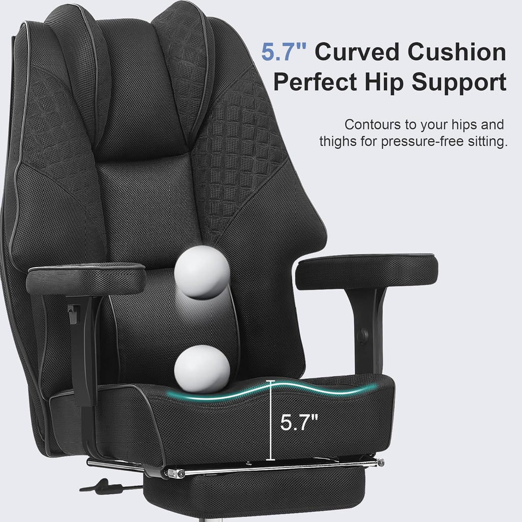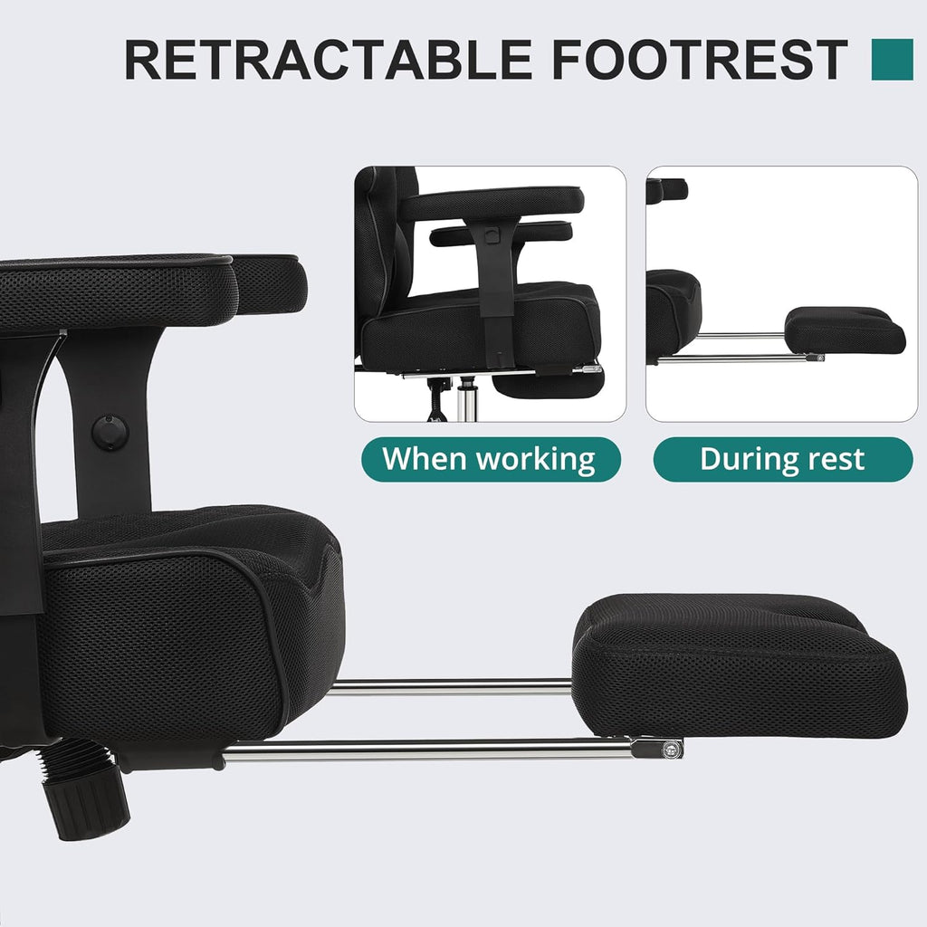 • Versatile Adjustability: Easily customize your comfort with height adjustment, 90°–125° reclining backrest, and adjustable armrests. The wide office chair smooth 360° swivel lets you move freely, and the retractable footrest tucks away when not in use—perfect for focused work or relaxed breaks