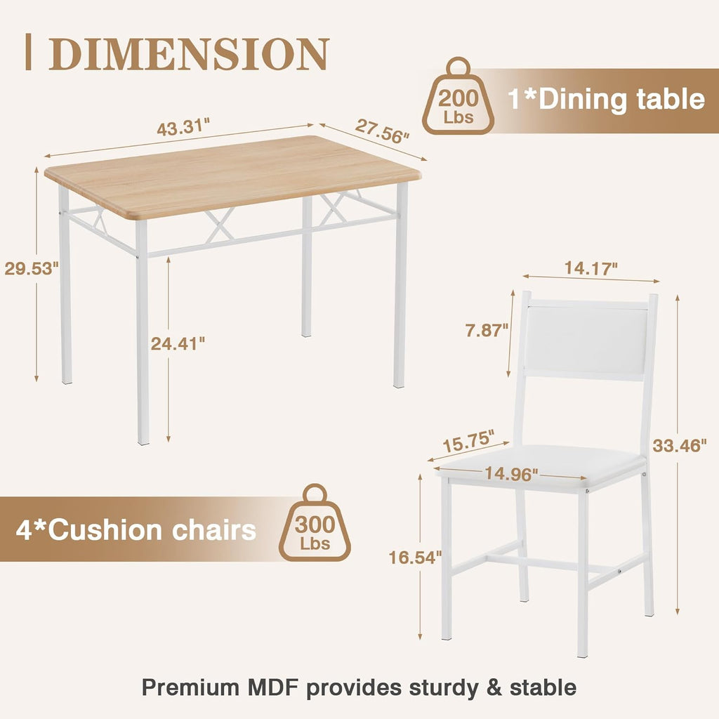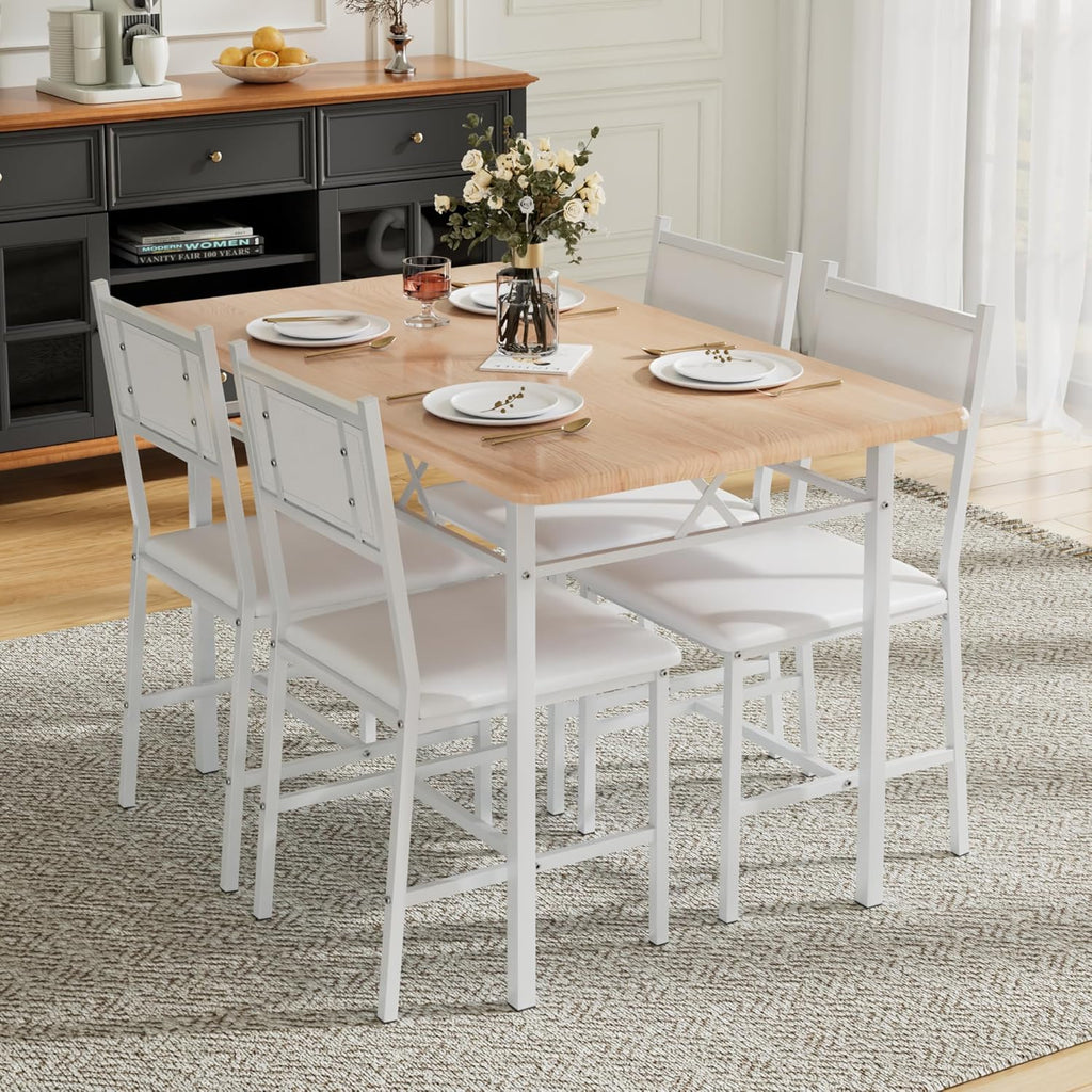 • Modern and Elegant Design: 5-piece dining table set includes a rectangular table and 4 upholstered chairs, with a natural woodgrain tabletop and a sleek white frame. Its minimalist design easily complements various spaces like kitchens, offices, and dining rooms, adding a touch of style to any decor.