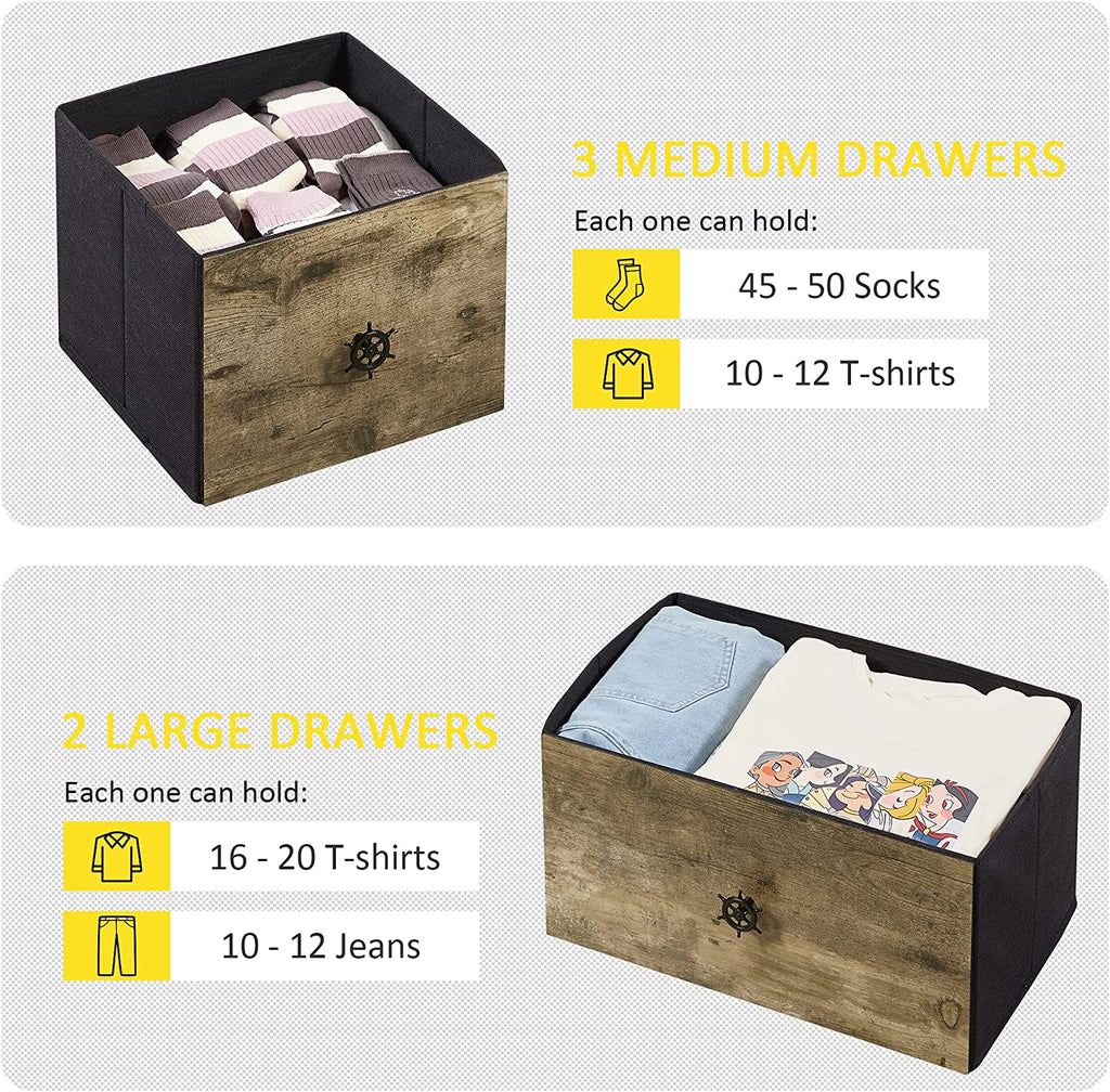 • MULTIFUNCTIONAL DRESSER: This 5-chest wood dresser with 2 upper large and 3 small lower deep drawers. Great for your bedside, closet, living room, child room, playroom, or hallway. Provide ample storage wherever you needed!