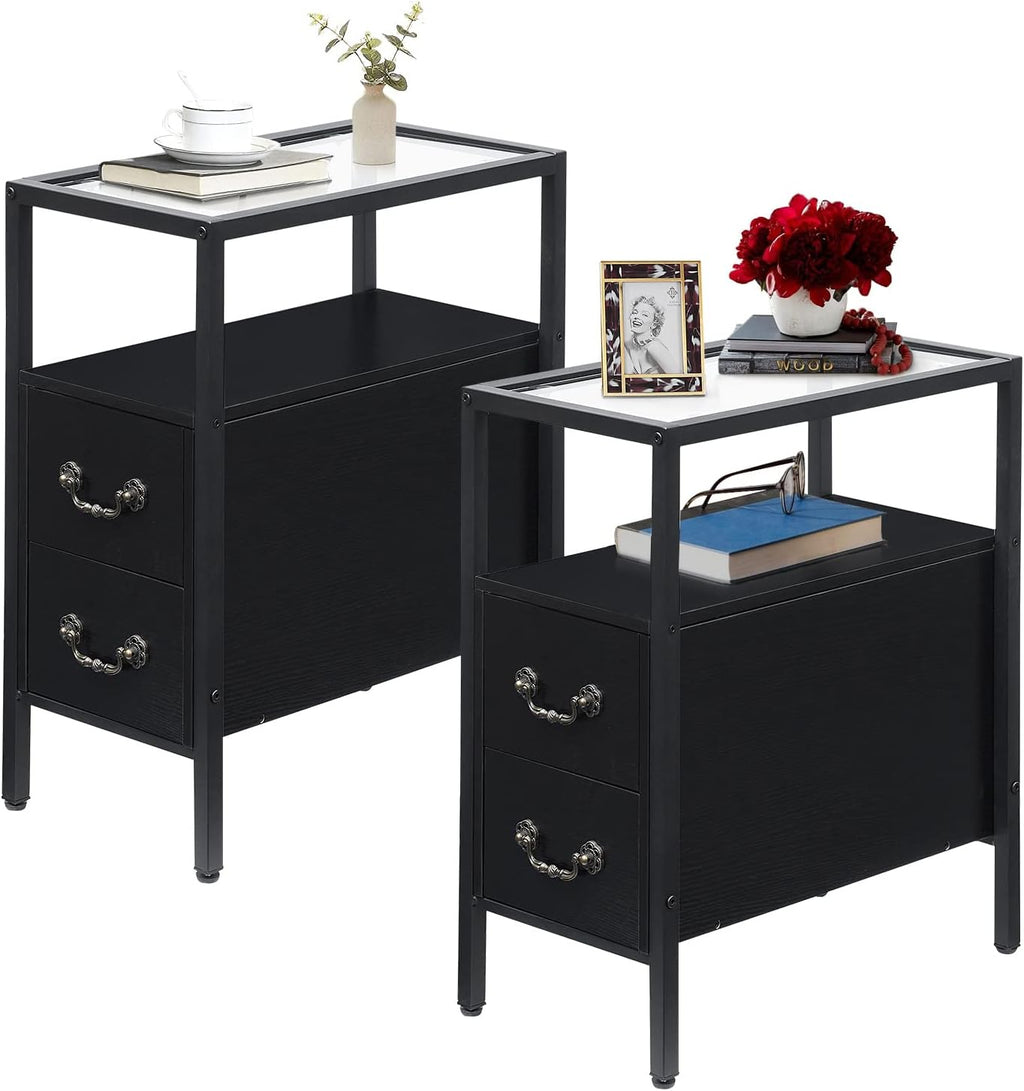 VECELO Narrow End Side Table/Nightstand with 2 Drawers & Open Shelf & Tempered Glass Top