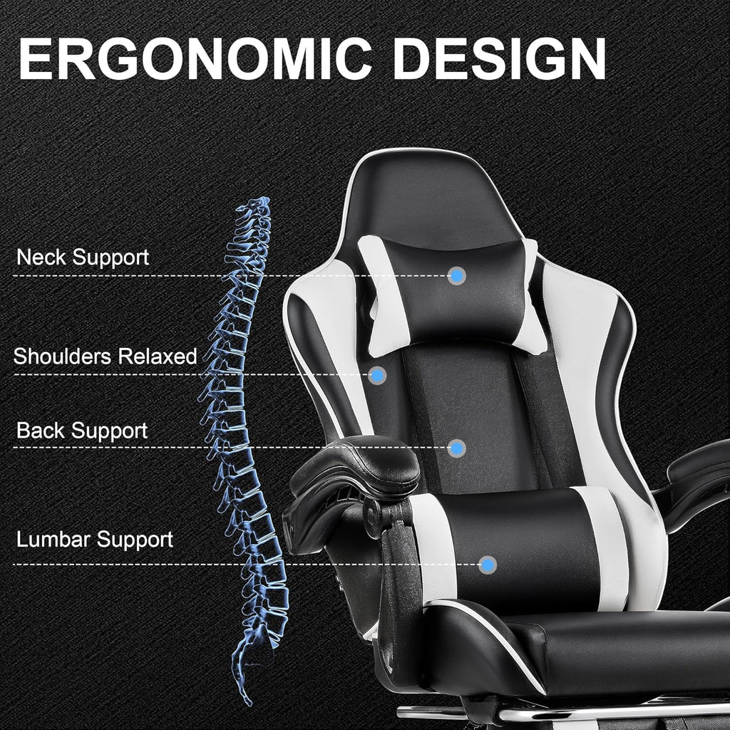 • Relaxing Support: The video game chair come with a supportive headrest, adjustable lumbar pillow, and a retractable footrest. This ergonomic office chair let you say goodbye to fatigue and hello to full-body comfort