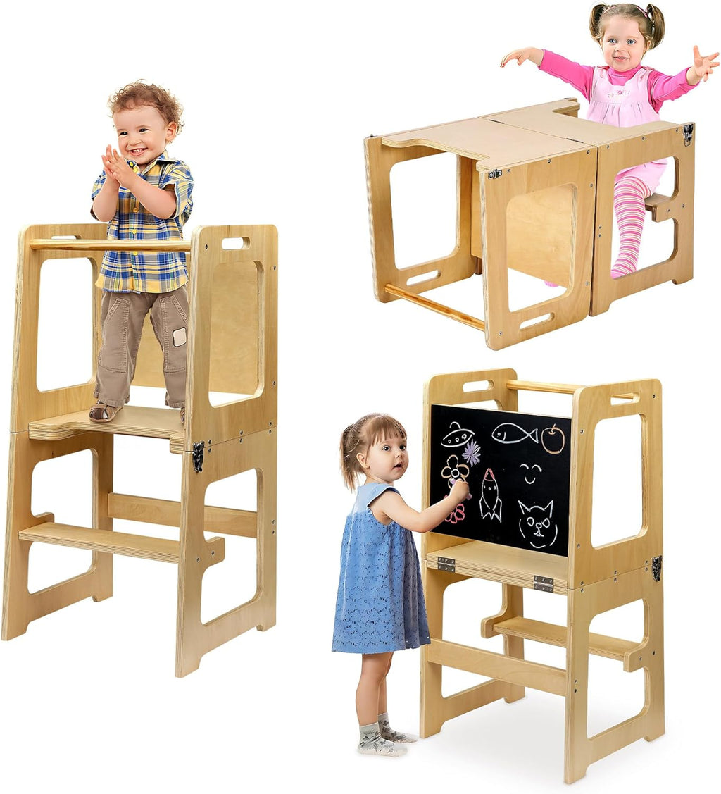 • Chalkboard Feature: Our kitchen stool for toddlers comes with a chalkboard surface, allowing kids to express their creativity. The toddler kitchen stool also serve as a memo board for family reminders.