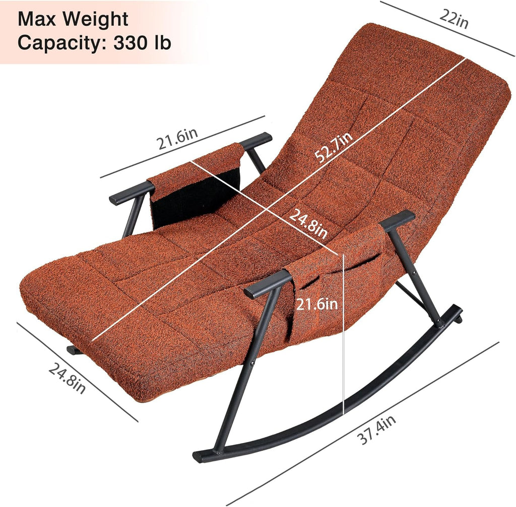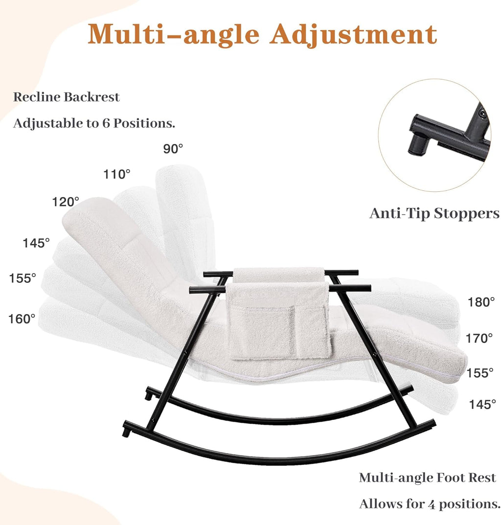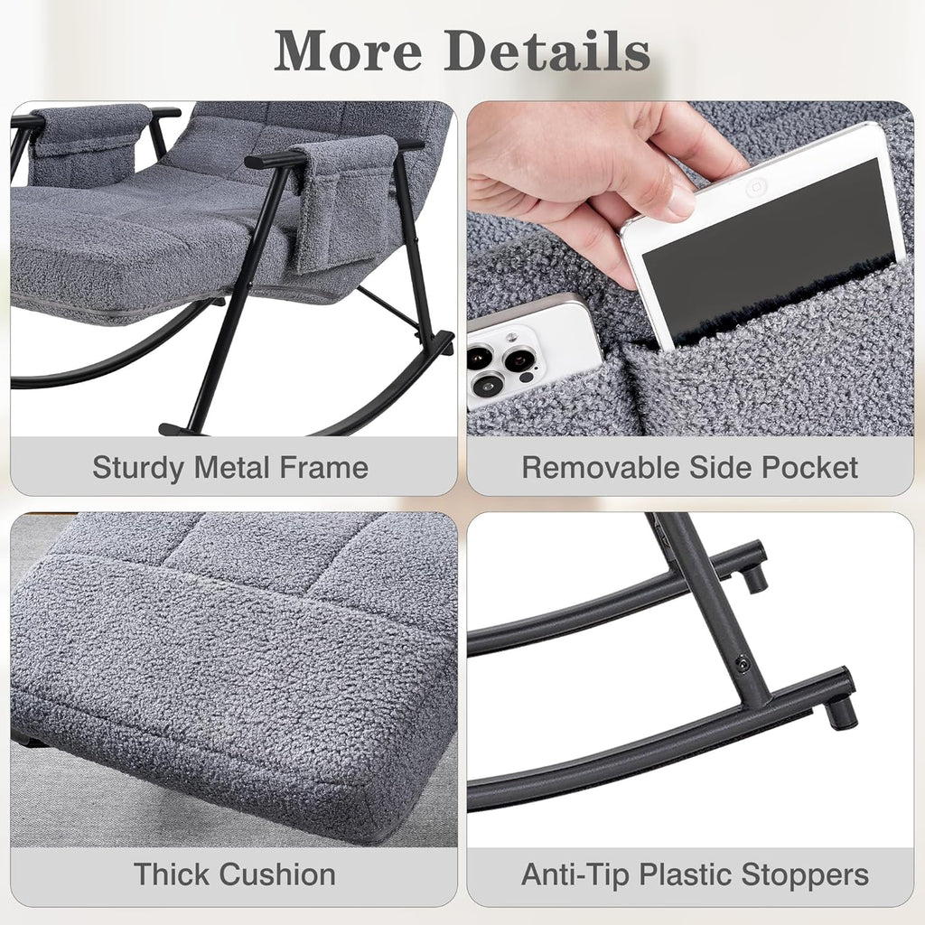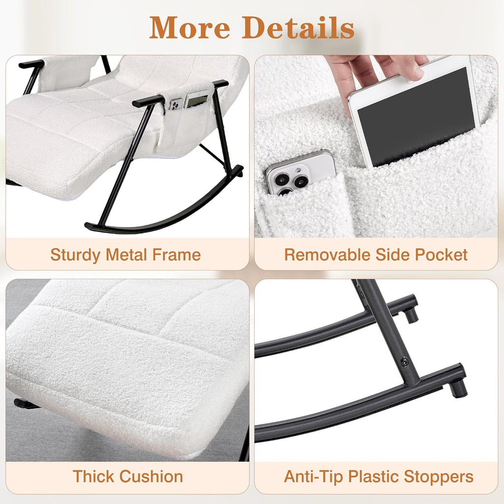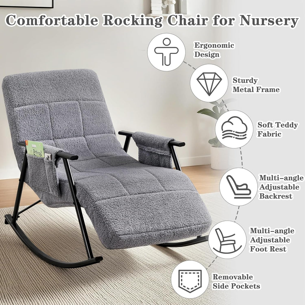 • High Quality & Comfortable: This rocking chair for nursery is built with a sturdy metal frame and soft teddy fabric with thick sponge, offering durability and comfort. The padded backrest and seat provide excellent support, the armrests ensure relaxed arm placement.