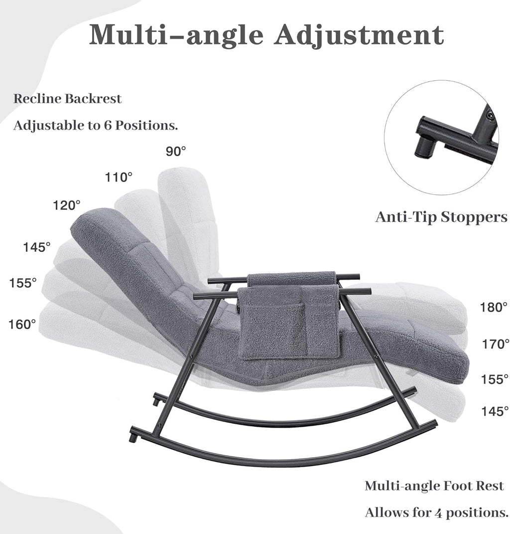 • Multi-angle Adjustment: VECELO Rocking chair features an ergonomic design with a high backrest adjustable to 90°, 110°, 120°, 145°, 155°, and 160°, and a footrest adjustable to 145°, 155°, 170°, and 180°. Our push back recliner chair provides optimal support and comfort for your various relaxation needs.