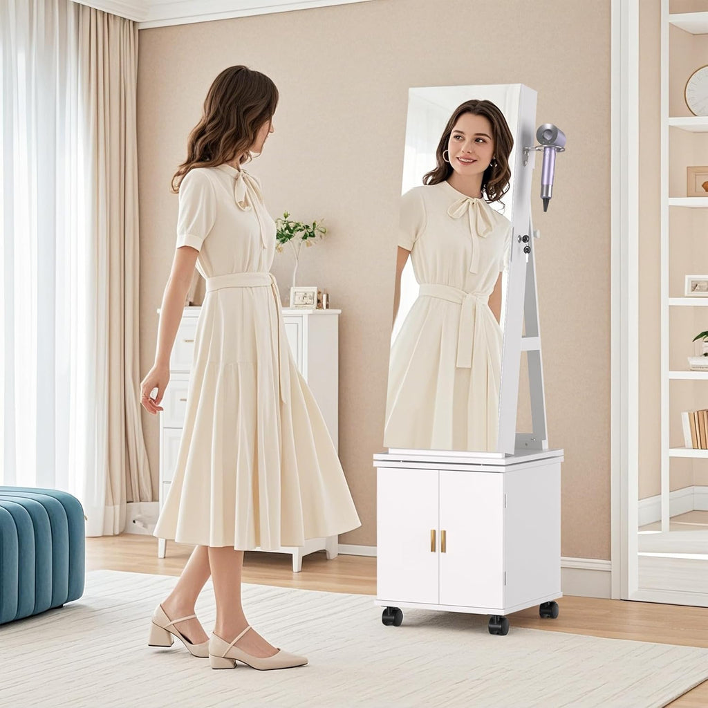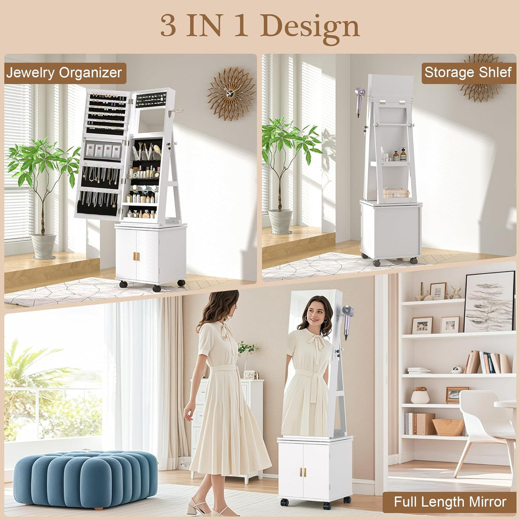 • 【Sophisticated Design】 :This freestanding jewelry cabinet boasts a modern, ivory finish, perfect for blending seamlessly with any decor style. The full-length mirror door allows you to view your entire outfit, while the interior offers a well-organized space to store all your treasured pieces.