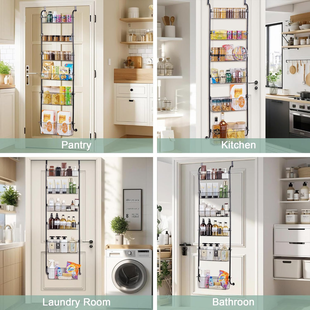 • Adjustable: Our pantry organizers has undergone structural updates, allow for flexible arrangement and adjustment of basket placement to accommodate items of different heights. Easily organize personal items and accessories while storing taller items on the over door storage shelf.