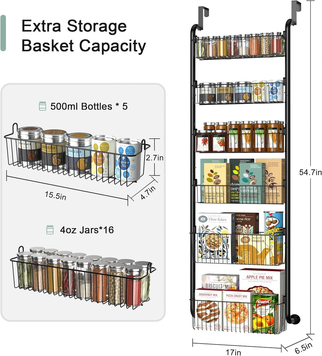 • Space-efficient: VECELO over door organizer maximize space using the area behind the door. With 6 baskets (4 small, 2 large), The pantry door organizer offer ample storage. Each small basket hold either three 500ml and one 300ml cans or 16 4oz jars. At 55 inches tall, the over door pantry organizer efficiently utilize door space.