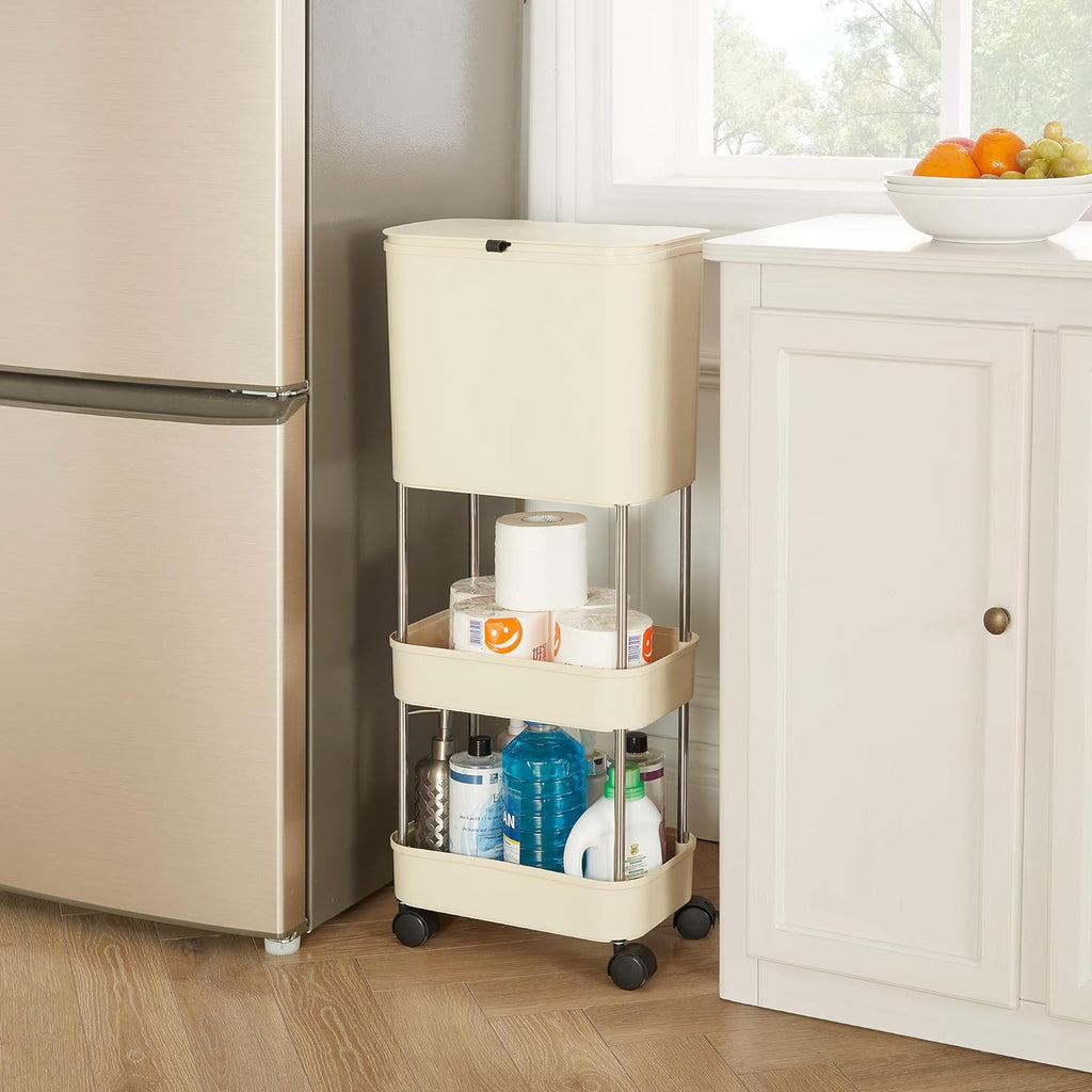 • Space-saving Shape: The slim and elongated design of the white trash can maximizes narrow spaces. It comes with lockable wheels for easy mobility or stability, making it ideal for bathrooms, living rooms, kitchens, dining areas, between cabinets, bathrooms, offices, and any other location.