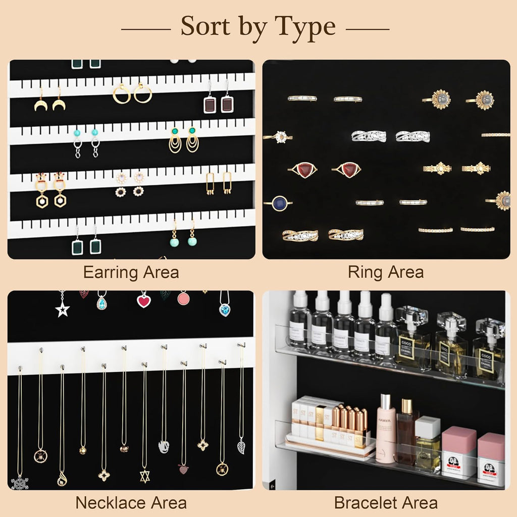 • Multi-functional Layout: Beyond its astonishing capacity, this jewelry mirror cabinet excels in versatility. Equipped with multiple compartments and adjustable partitions, it flexibly adapts to the sizes of your items, fitting lipstick, eyeshadow palettes, makeup brushes, hair ties, hairpins, and more.