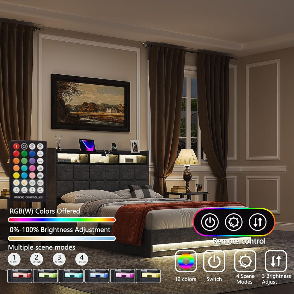 • Integrated LED Lighting: Soft, color-adjustable LED strips on the upholstered bed frames headboard and base provide ambient illumination for style and nighttime convenience.