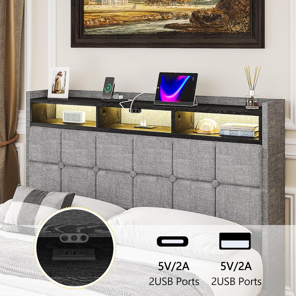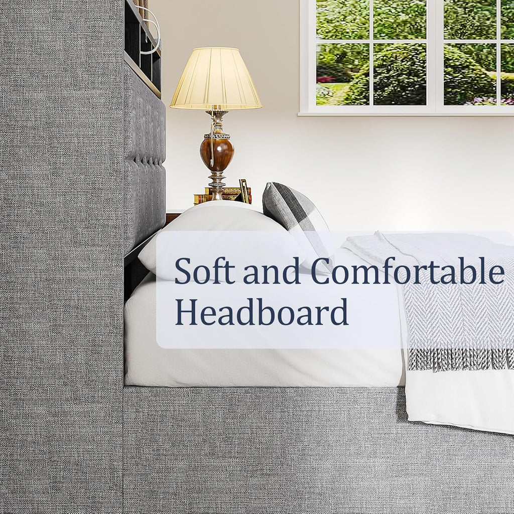 • Headboard with Charging & Storage: The bed frame with headboard headboard includes open shelves and a 4-port charging station, keeping essentials within reach of the bed.