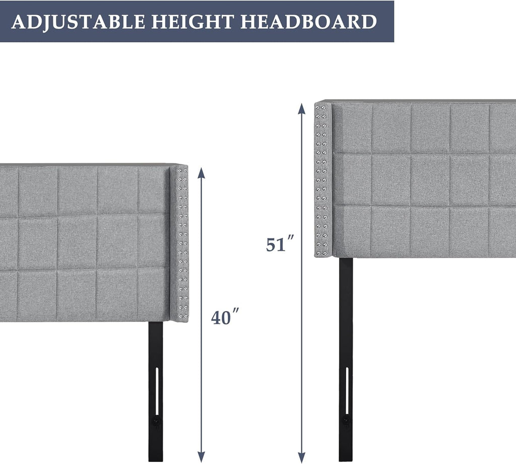 • Adjustable Headboard: The headboard is available in 6 optional adjustable heights. There are 2 sets of pre-drilled holes at the back, and 6 height-adjustable mounting positions from 40" to 49.8" in 3" increments, to fit most bed frames and bases.