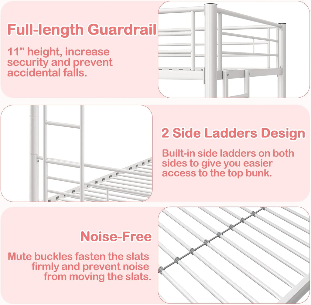 • [Safety Bunk Beds] - The upper bed of our twin over twin bunk bed is surrounded by 11" height full-length guardrails, ensuring that your child stay secure throughout the night, preventing accidental falls, and providing a safe and cozy environment for your children. We've included two side ladders in the design to guarantee easy and convenient access to the top bunk.