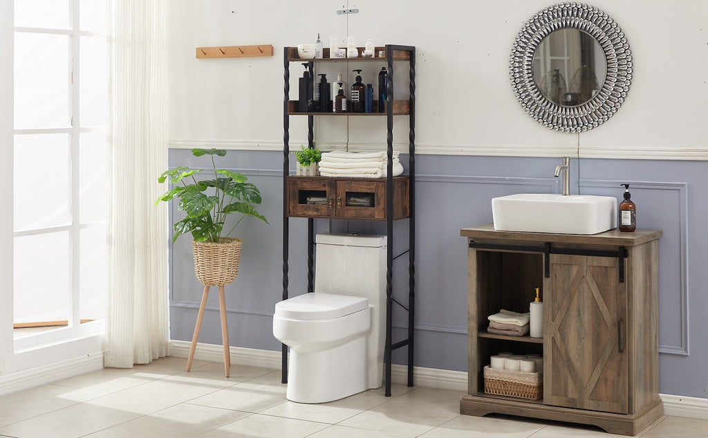 • [INDUSTRIAL SIMPLE DESIGN]--The over toilet bathroom organizer has rustic brown board and black metal frame, which shows the elegant and noble taste and provide unique scenery in your bathroom.
