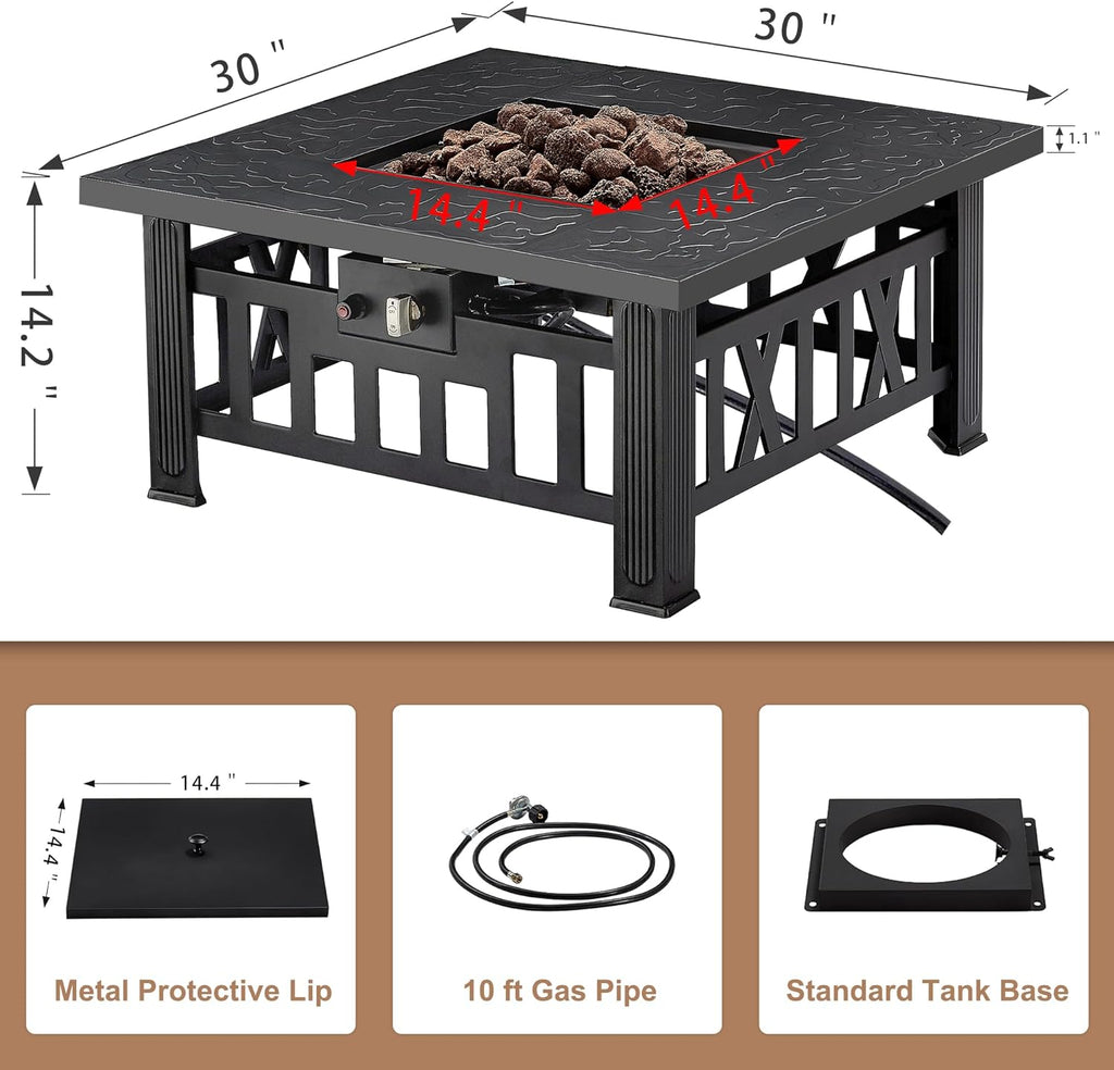 • What is You Concern More: 30 L x 30 W inch. square gas fire pit tabletop, 14.17" height, net weight 40 lbs. Package Included: square removable lid, cylinder base, protective net, gas pipe, 6.6 lbs lava rocks, AAA battery, user manual.