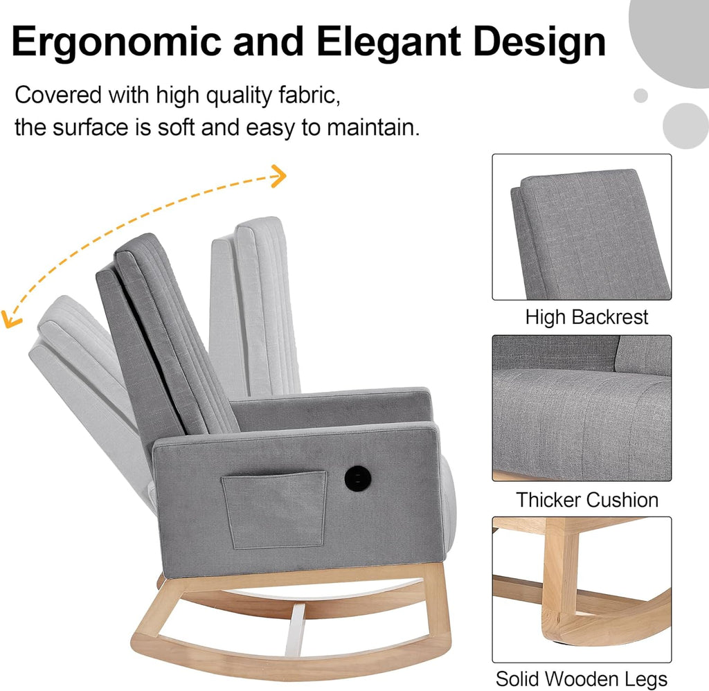 VECELO Rocking Chair Upholstered Nursery Glider Rocker High Backrest Comfy Armchair with Side Pocket and USB Port