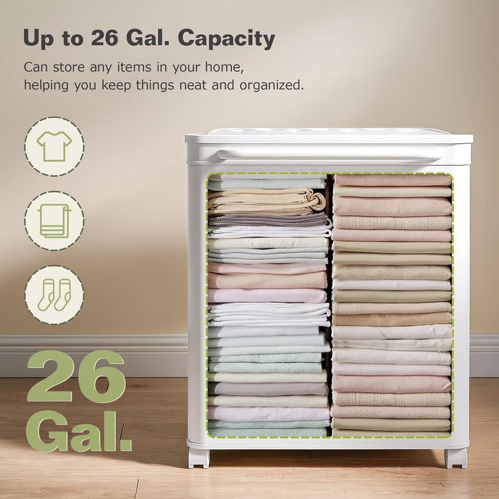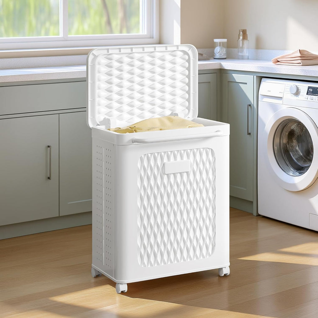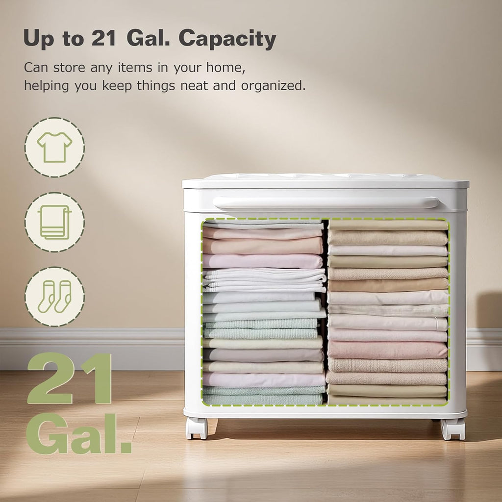 • 【360°Castor Design】As a rolling storage cabinet plastic, this hamper with lid is equipped with 360°swivel wheels for smooth, effortless movement. No need to lift or bend—simply roll it from room to room. This plastic hamper with lid is perfect for narrow hallways, bedrooms, or laundry rooms