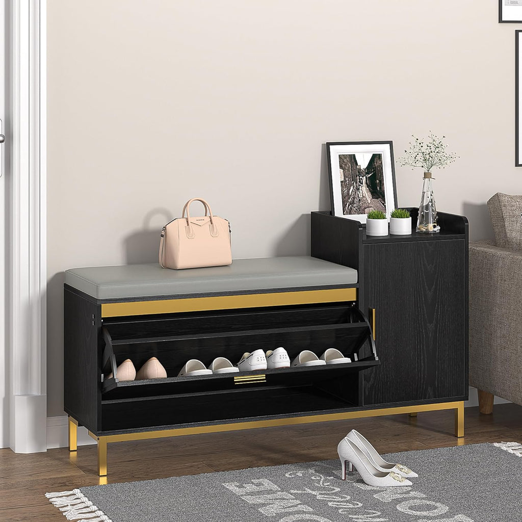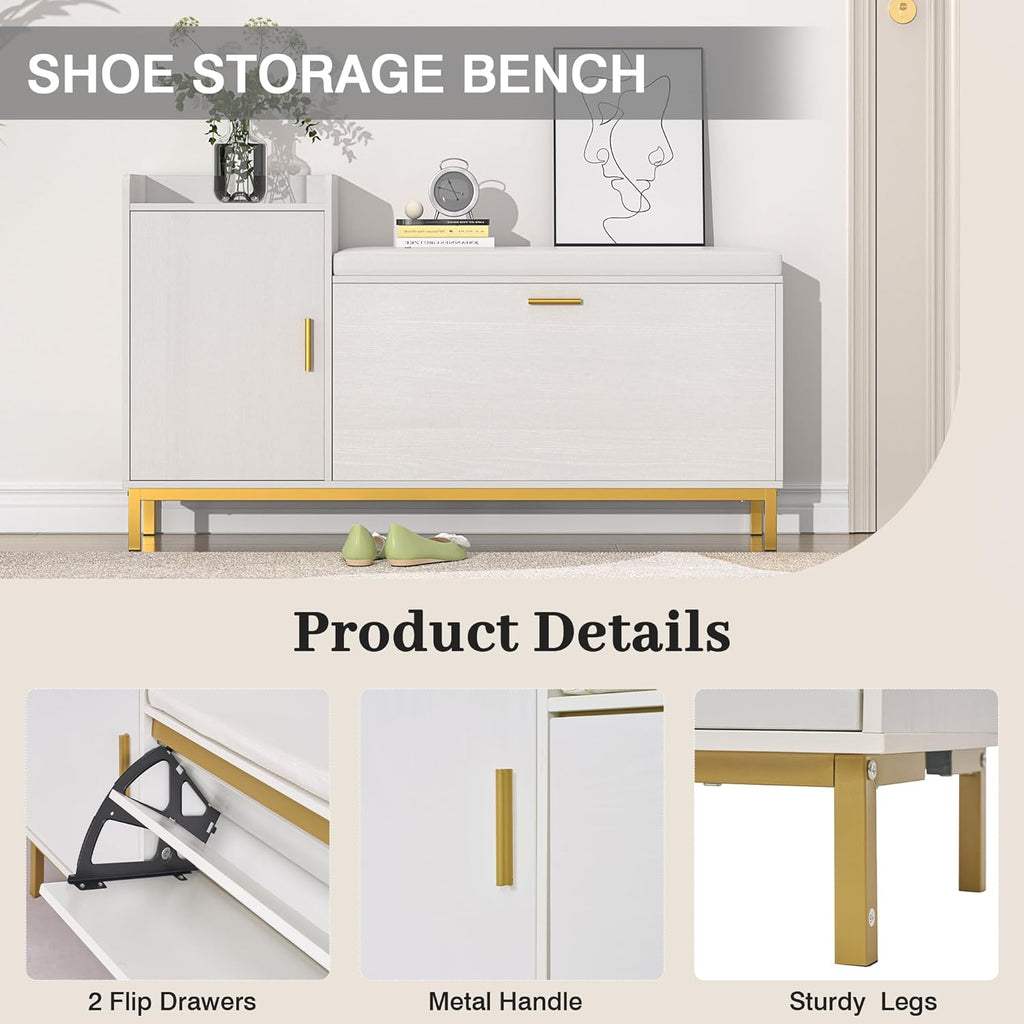 • Flip Drawers Shoe Storage Bench:Shoe bench with flip drawers storage can store up to 8-12 pairs shoes (depending on the sizes of shoes), keeping your shoes well organized and reduce clutter. The panel in each compartment is removable or adjustable to meet your different shoes storage needs.