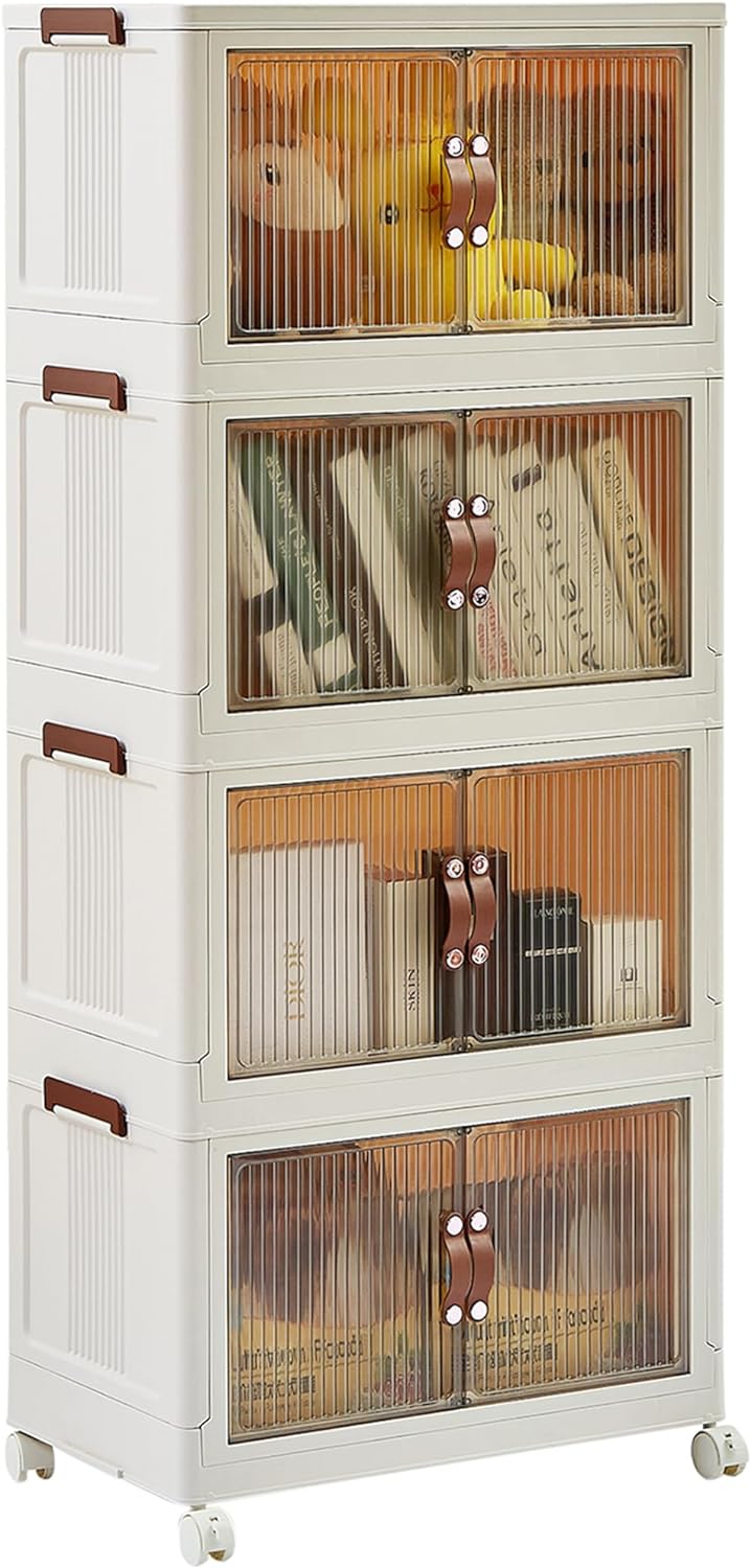 VECELO Stackable Bins with Lid, Plastic Collapsible Cabinet Foldable Folding Box Organizer/Storage Container Cart
