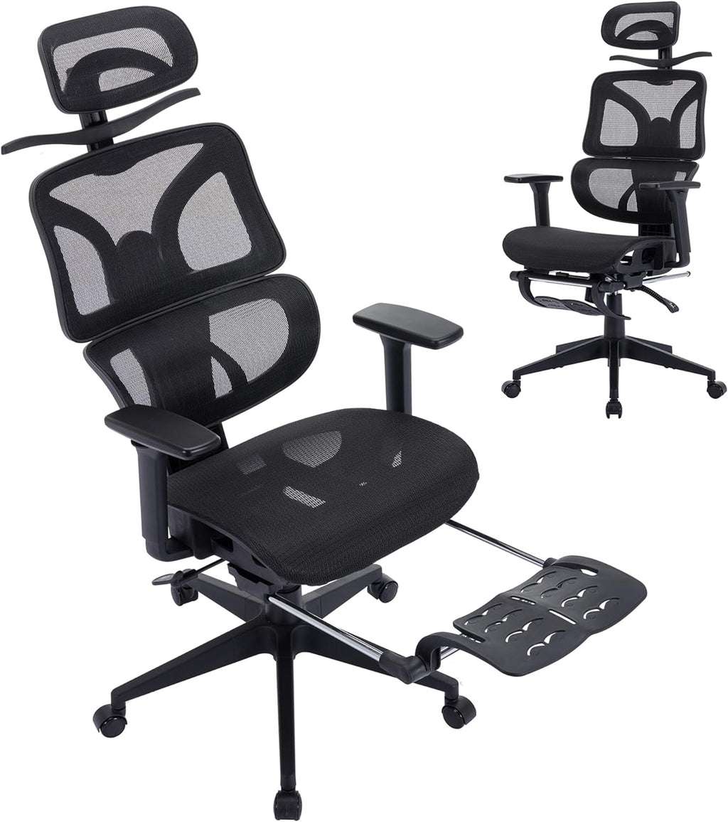 • 【Multi-Functional Desk Chair】This office chair with adjustable arms features adjustable seat height (19.2-22.3 inches), a reclining function that can be locked at any angle between 90°-125°, a hidden retractable footrest for convenient sliding, and fatigue-relieving leg support. With 3D adjustable headrest and armrests, the work chairs for home office provide optimal support for neck and elbows.