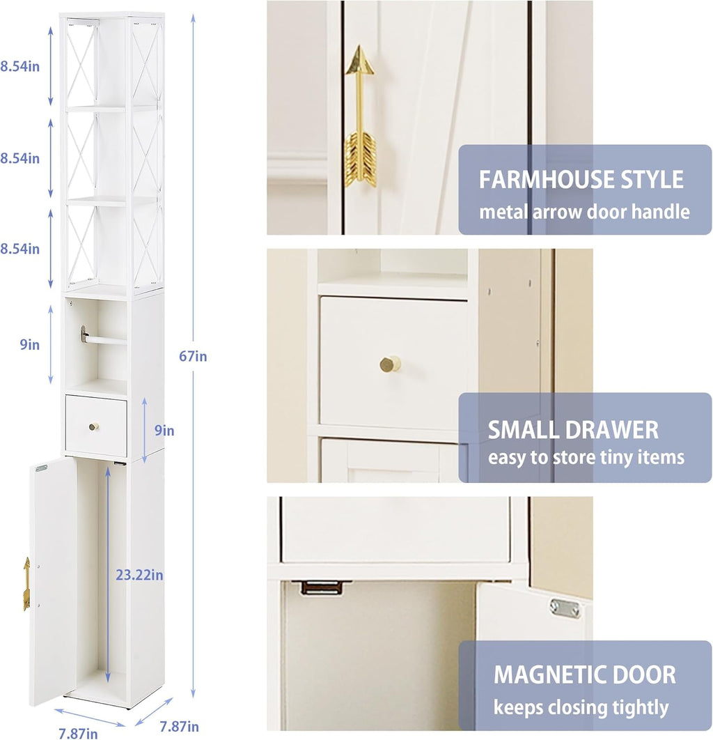 • 🎃【Suitable Size for Space-Saving】:Overall Size at 7.87”D X 7.87”W X 66.93"H, This tall cabinet for bathroom in a perfect size takes full advantage of narrow spaces, easily fitting into a place with limited space when you need more extra storage next to the pedestal sink or toilet.