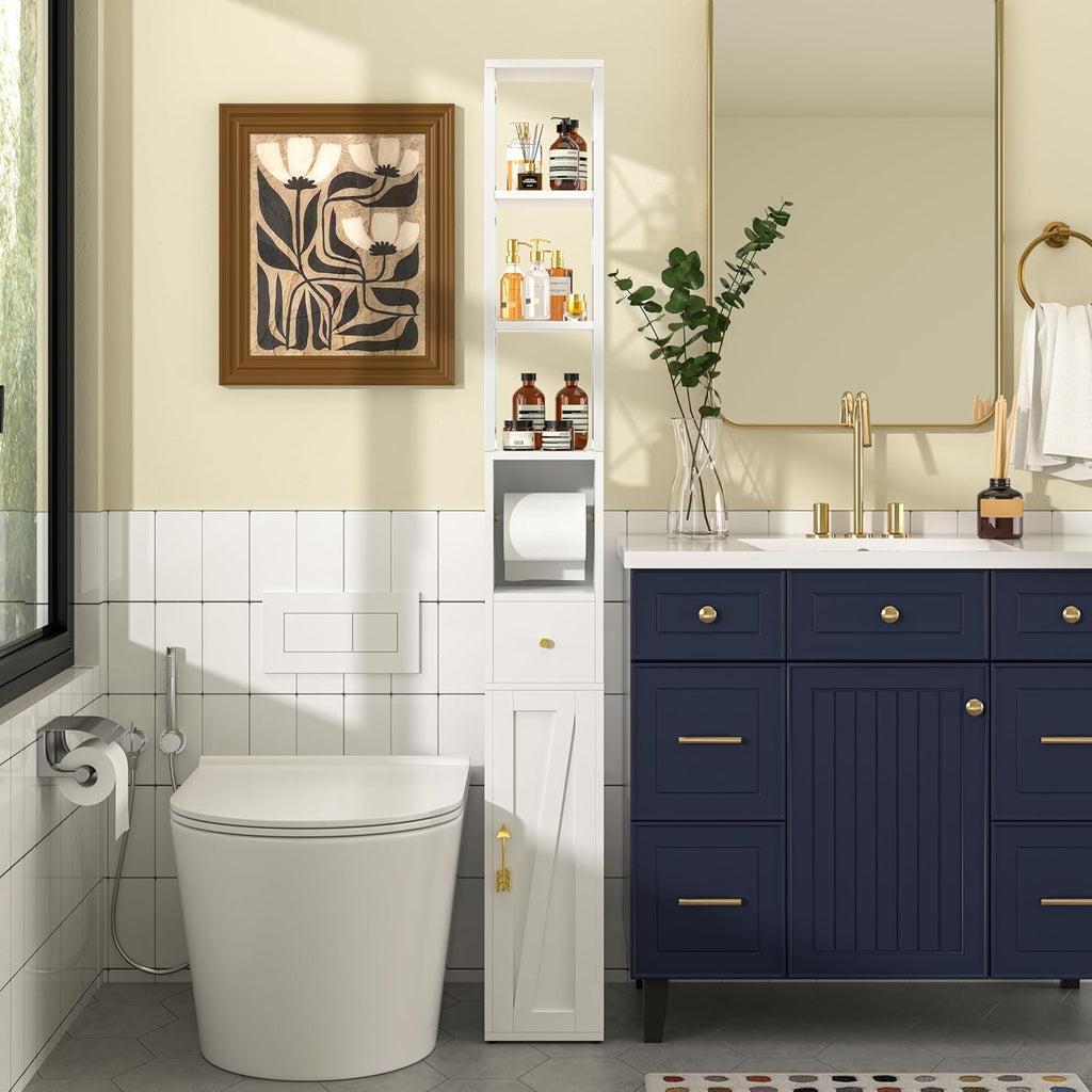 • 🎃【Ample Storage Space】: Equipped with multiple storage compartments, drawers and tissue paper scroll, this slim bathroom cabinet with doors provide ample space to neatly organize toiletries, towels, and personal care items, keeping your bathroom tidy and clutter-free.