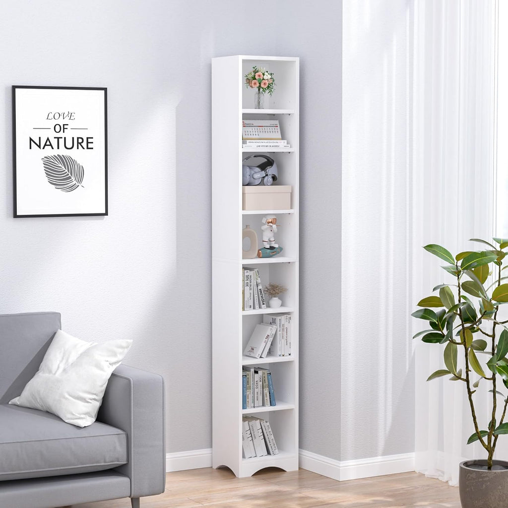 VECELO Tall Narrow Bookcase with Adjustable Shelves – Stylish Slim Storage Cabinet with Moisture-Resistant Base and Space-Saving Design for Home Office – Elegant White Finish