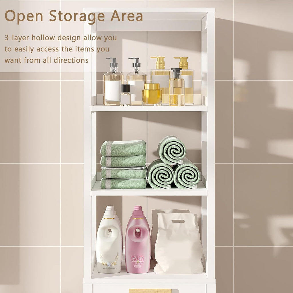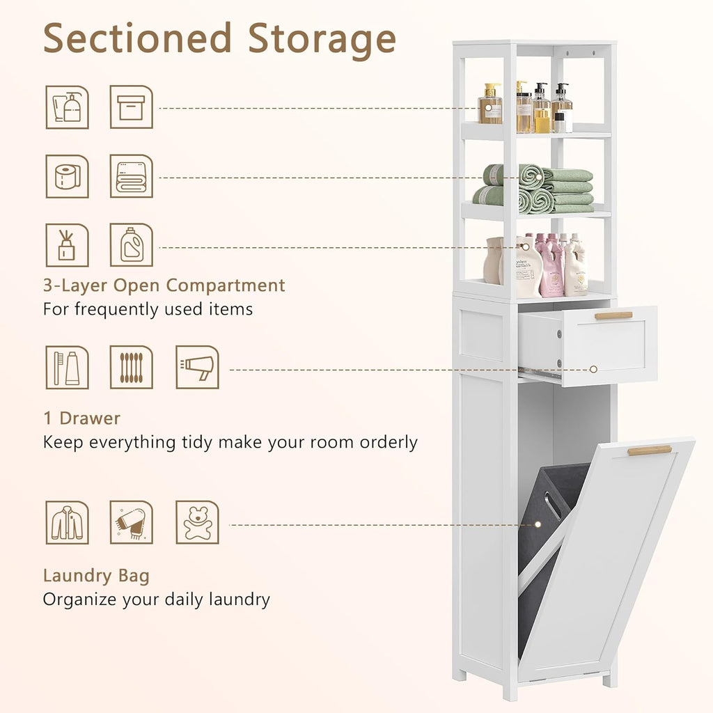 • 【Spacious and versatile】With 3 open storage compartments, 1 drawer, and 1 hidden laundry hamper to maximize vertical space, this laundry storage cabinet is ideal for tight spaces and the laundry hamper cabinet will meet your everyday needs