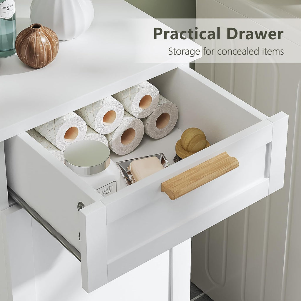• Ample Storage Capacity: Designed with a top drawer, a hidden laundry basket and four side-mounted metal hooks, this laundry cabinet offers versatile storage for clothes, towels, ideal for small or compact areas.