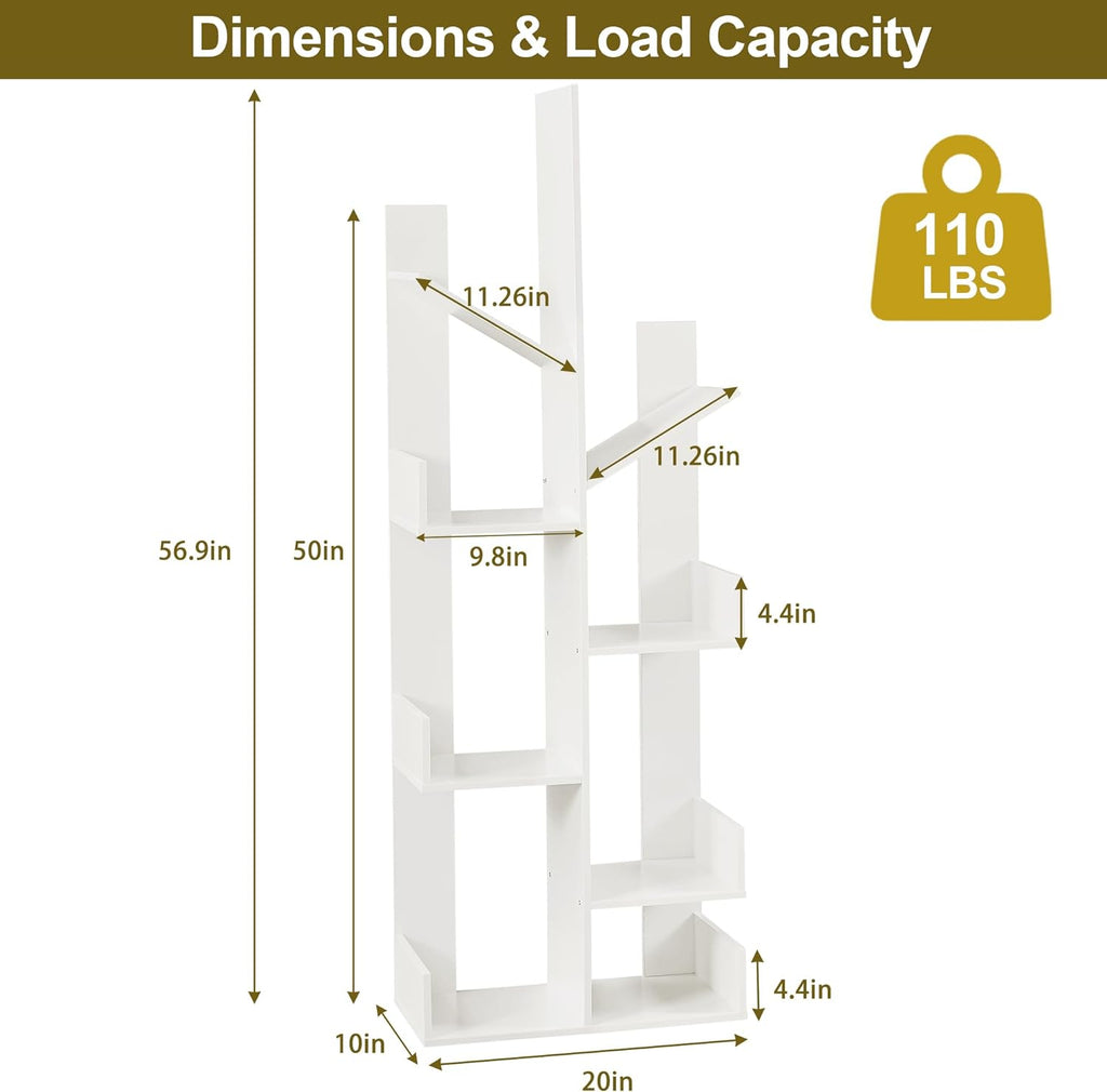 • 【Suitable Size&Load Capacity】 - Dimensions: This tree bookcase measures: 20''L x 10"W x 56.9''H, Load Capacity of each shelf: 20lbs, only takes little corner space to create a reading corner in your living room, bedroom or office easily.