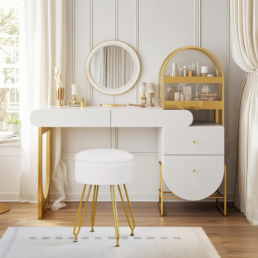 • Luxurious Vanity Chair: This stools for vanity, with its soft touch and elegant white hue, brings a touch of luxury and refinement to your home space. The gold legs add a modern twist and a hint of understated luxury. It is not just furniture; it's a part of your elegant lifestyle.